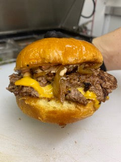 Ingredients ( Grilled Onions, American or Cheddar Cheese, and home-made Smash Sauce) (Served on a Brioche Bun)