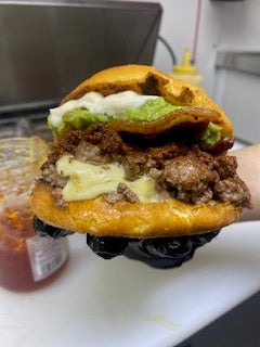 Ingredients ( 2 Beef Pattie, Chorizo, Pepper Jack Cheese, Guacamole, bacon, pepper Jelly & Mayo) (Served on a Brioche Bun)