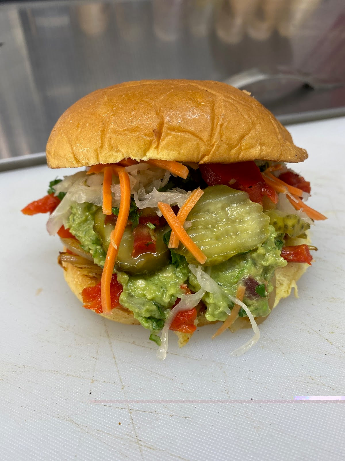 Ingredients ( Grilled Pepper, grilled Onions, Pickled Carrot, Gucamole and Mayo is Optional) (Served on a Brioche Bun)